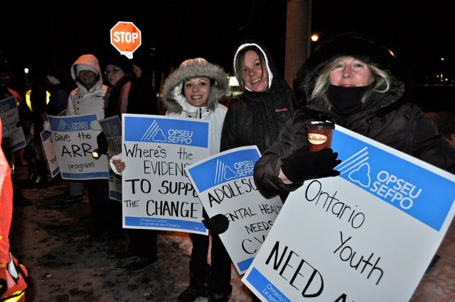 Workers brave the freezing cold to greet arriving board members at Ontario Shores. Most board members ducked the demo by arriving early.