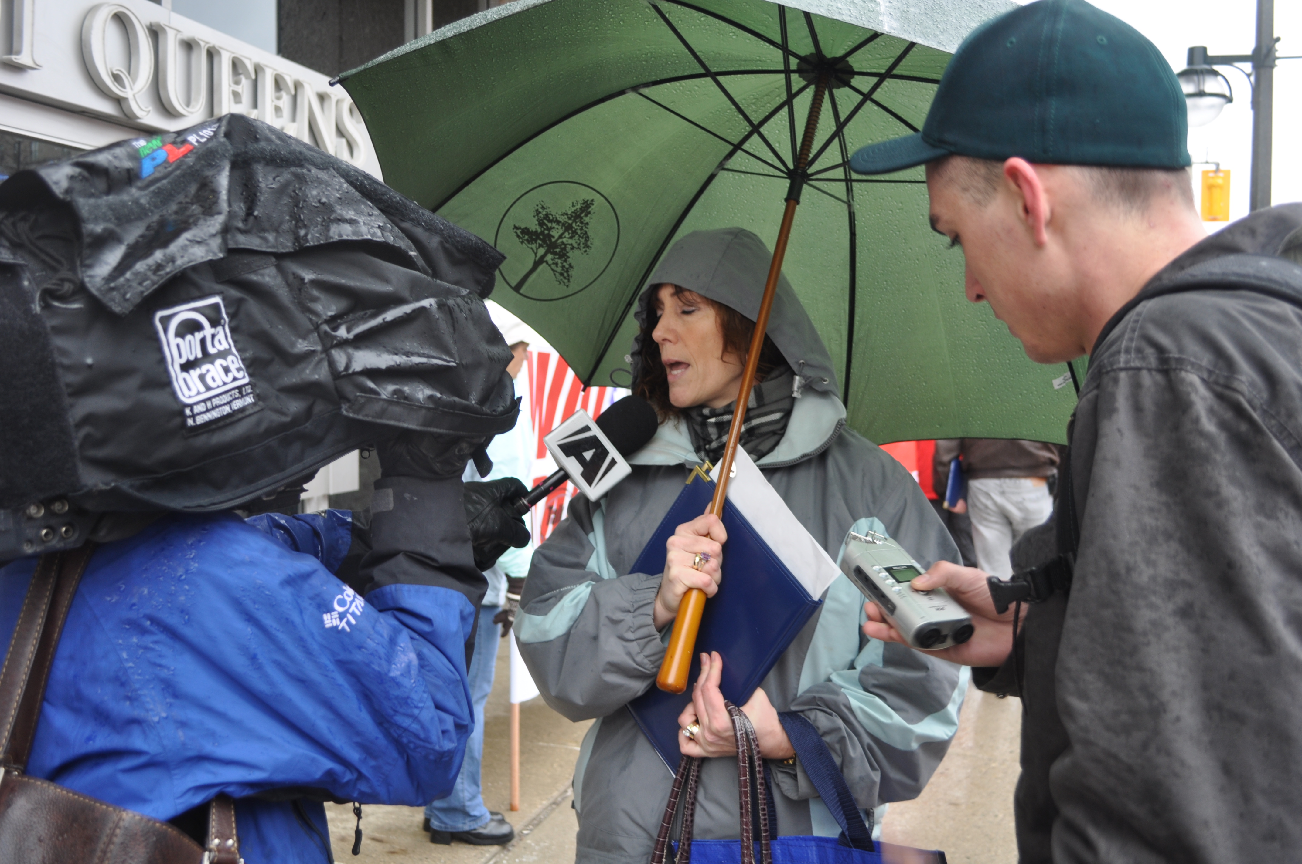 Local 152 VP Elizabeth Craik is interviewed by the media outside the SW LHIN offices in downtown London.