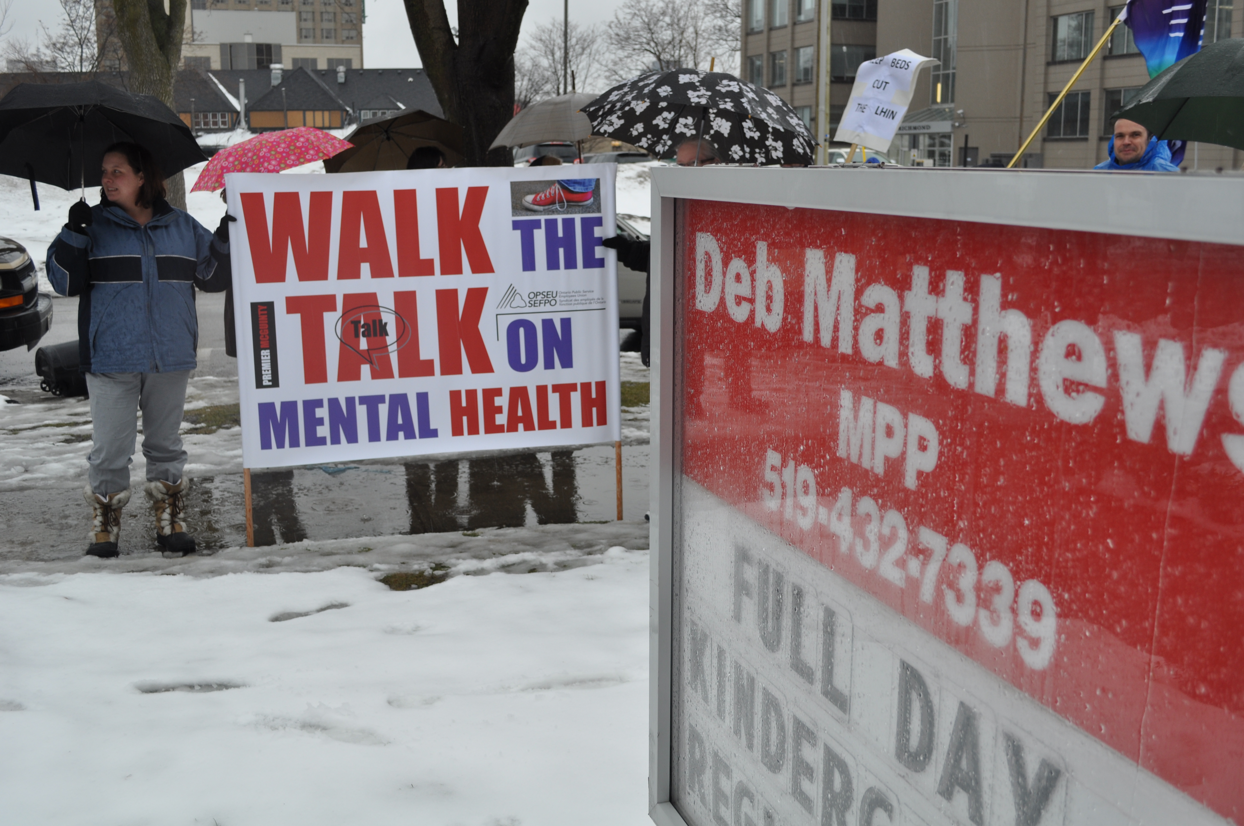 LONDON – Standing in the freezing rain March 9, about 25 OPSEU activists in downtown London, Ontario called upon the McGuinty government to “walk the talk” on mental health March 9th