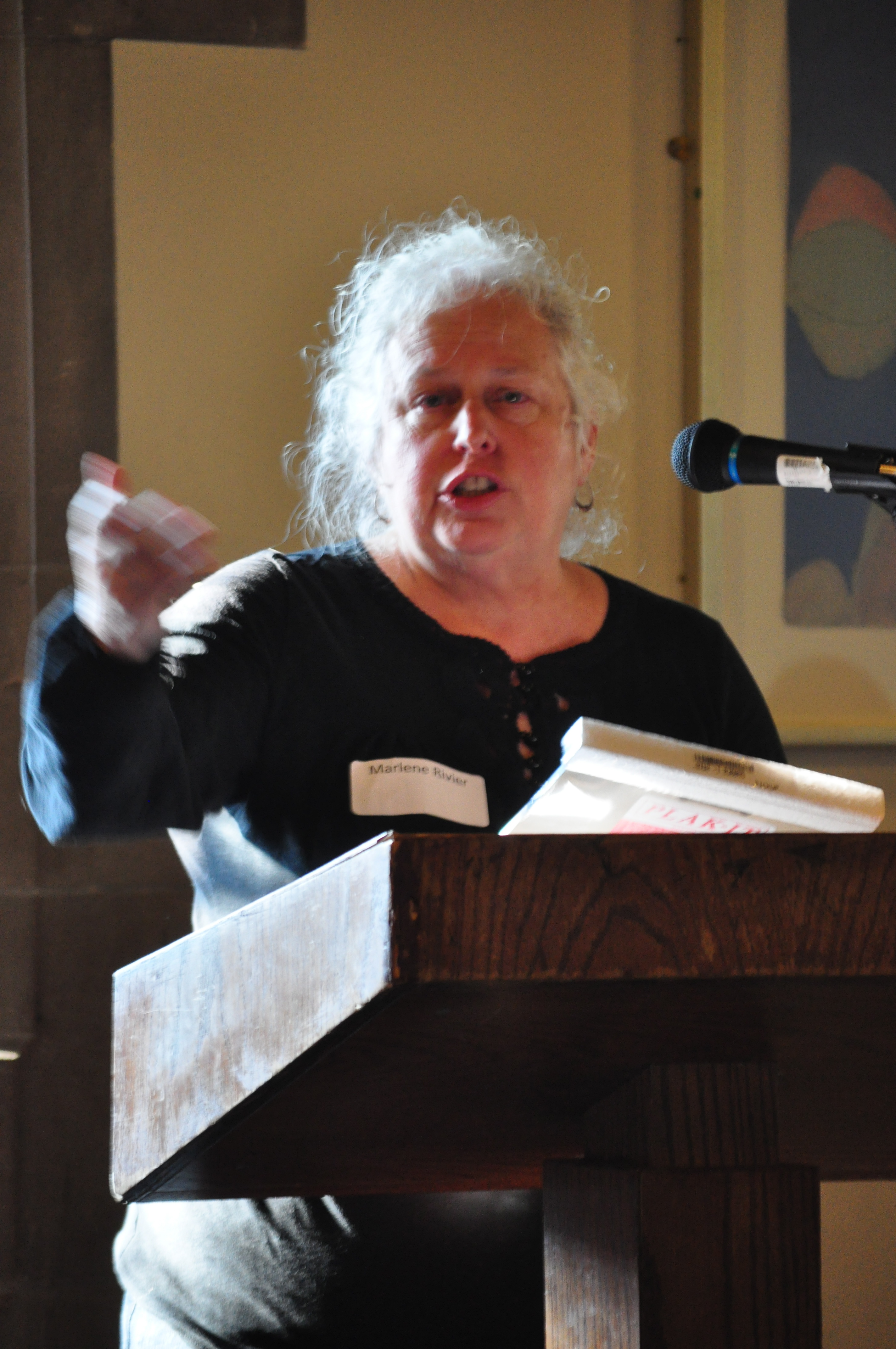 6. Is there a union activist in the room? Niagara’s Sue Hotte is known for her exuberant sales pitch for various fundraising items from the Ontario Health Coalition. However, when she climbed on a chair so the audience could get a better view of the OHC t-shirt she was modeling, half the audience gasped in unison “Health and Safety!” We train them well.
